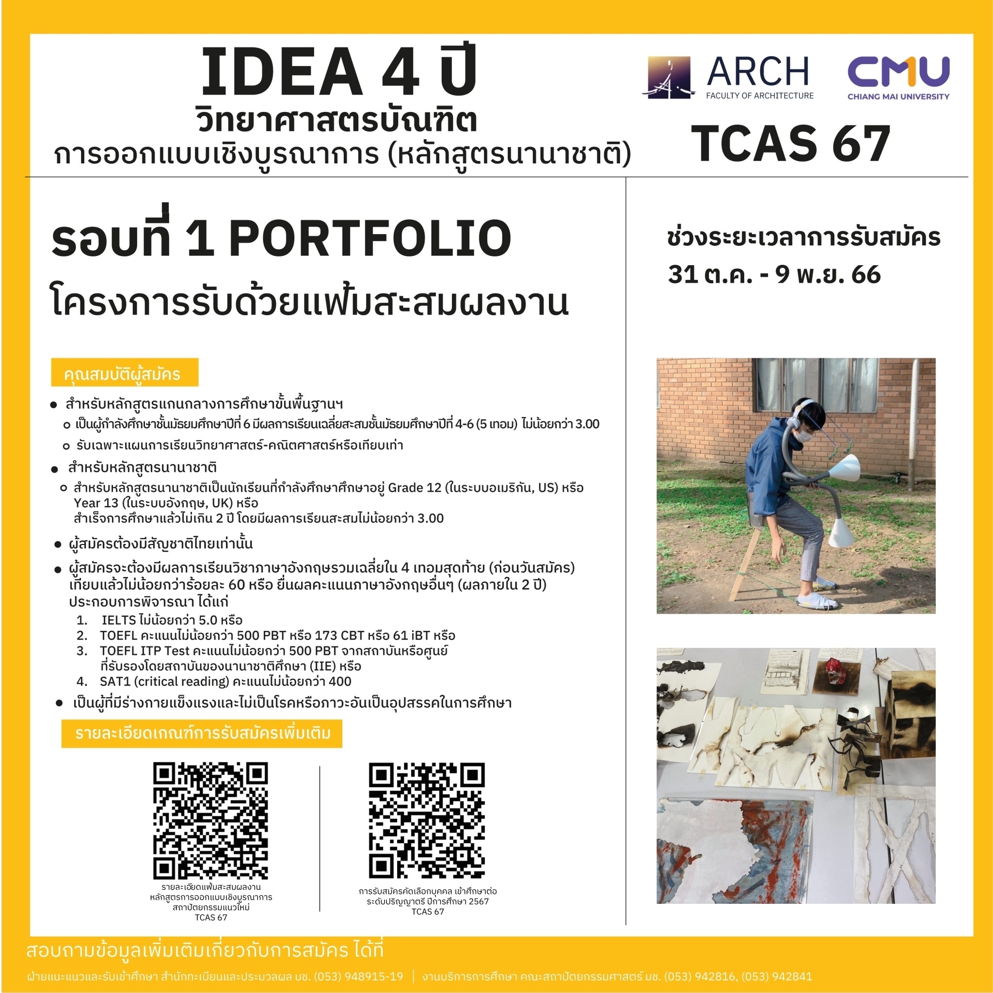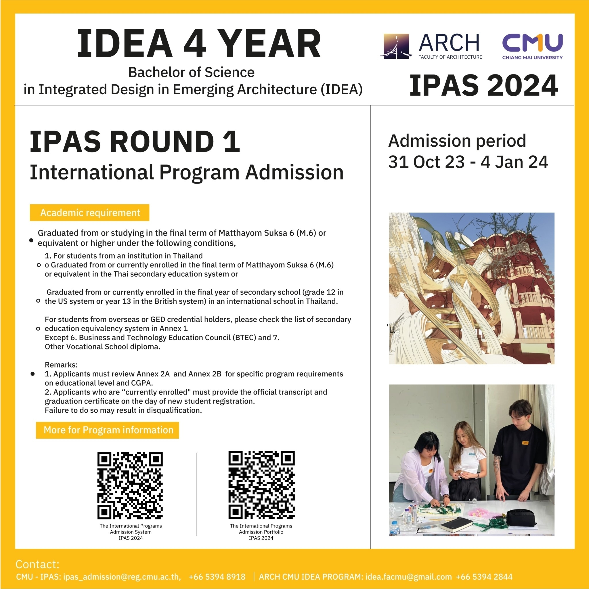 | IDEA วิทยาศาสตรบัณฑิต สาขาวิชาการออกแบบเชิงบูรณาการสถาปัตยกรรมแนวใหม่ หลักสูตรนานาชาติ 4 ปี | ทุนสนับสนุนการศึกษาสำหรับนักศึกษาหลักสูตรนานาชาติระดับปริญญาตรีและระดับบัณฑิตศึกษา คณะสถาปัตยกรรมศาสตร์ มหาวิทยาลัยเชียงใหม่ |