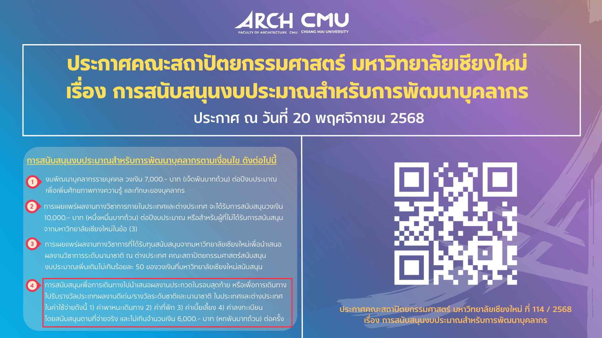 ประกาศคณะสถาปัตยกรรมศาสตร์ มหาวิทยาลัยเชียงใหม่ เรื่อง การสนับสนุนงบประมาณสำหรับการพัฒนาบุคลากร <คลิก> ประกาศ ณ วันที่ 20 พฤศจิกายน พ.ศ. 2568