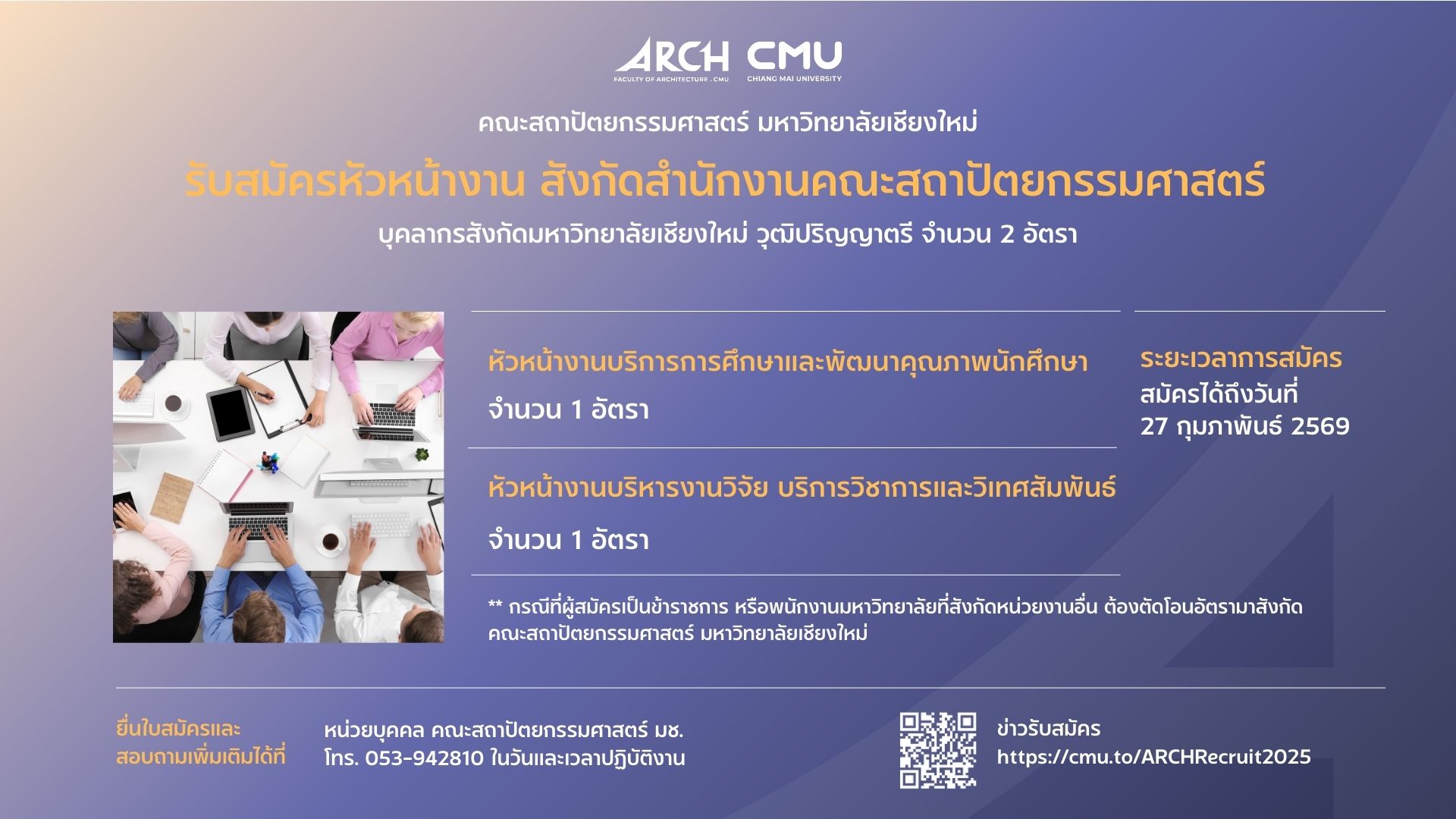 คณะสถาปัตยกรรมศาสตร์ เปิดรับสมัครบุคลากรสังกัดมหาวิทยาลัยเชียงใหม่ เพื่อคัดเลือกให้ดำรงตำแหน่งหัวหน้างานบริหารงานวิจัย บริการวิชาการและวิเทศสัมพันธ์ สังกัดสำนักงานคณะสถาปัตยกรรมศาสตร์
