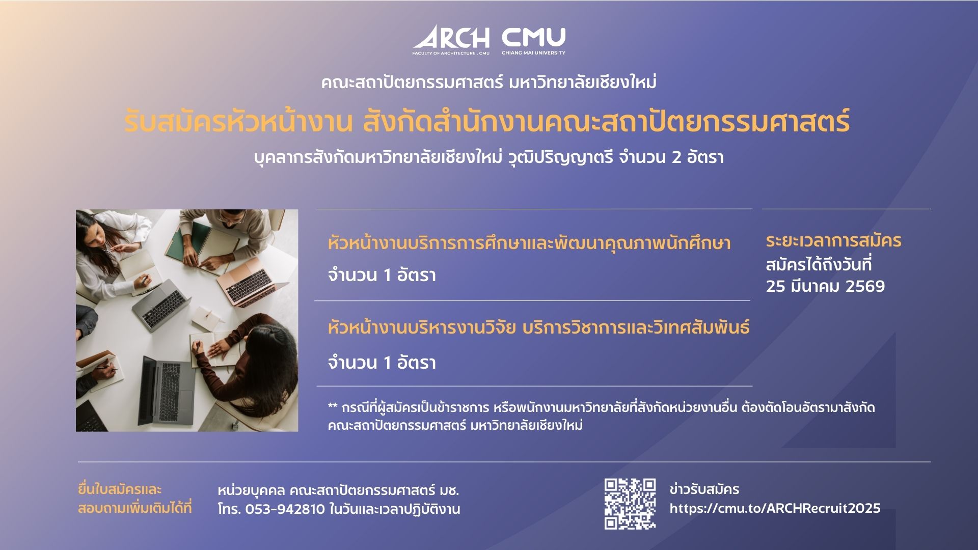 คณะสถาปัตยกรรมศาสตร์ เปิดรับสมัครบุคลากรสังกัดมหาวิทยาลัยเชียงใหม่ เพื่อคัดเลือกให้ดำรงตำแหน่งหัวหน้างานบริหารงานวิจัย บริการวิชาการและวิเทศสัมพันธ์ สังกัดสำนักงานคณะสถาปัตยกรรมศาสตร์